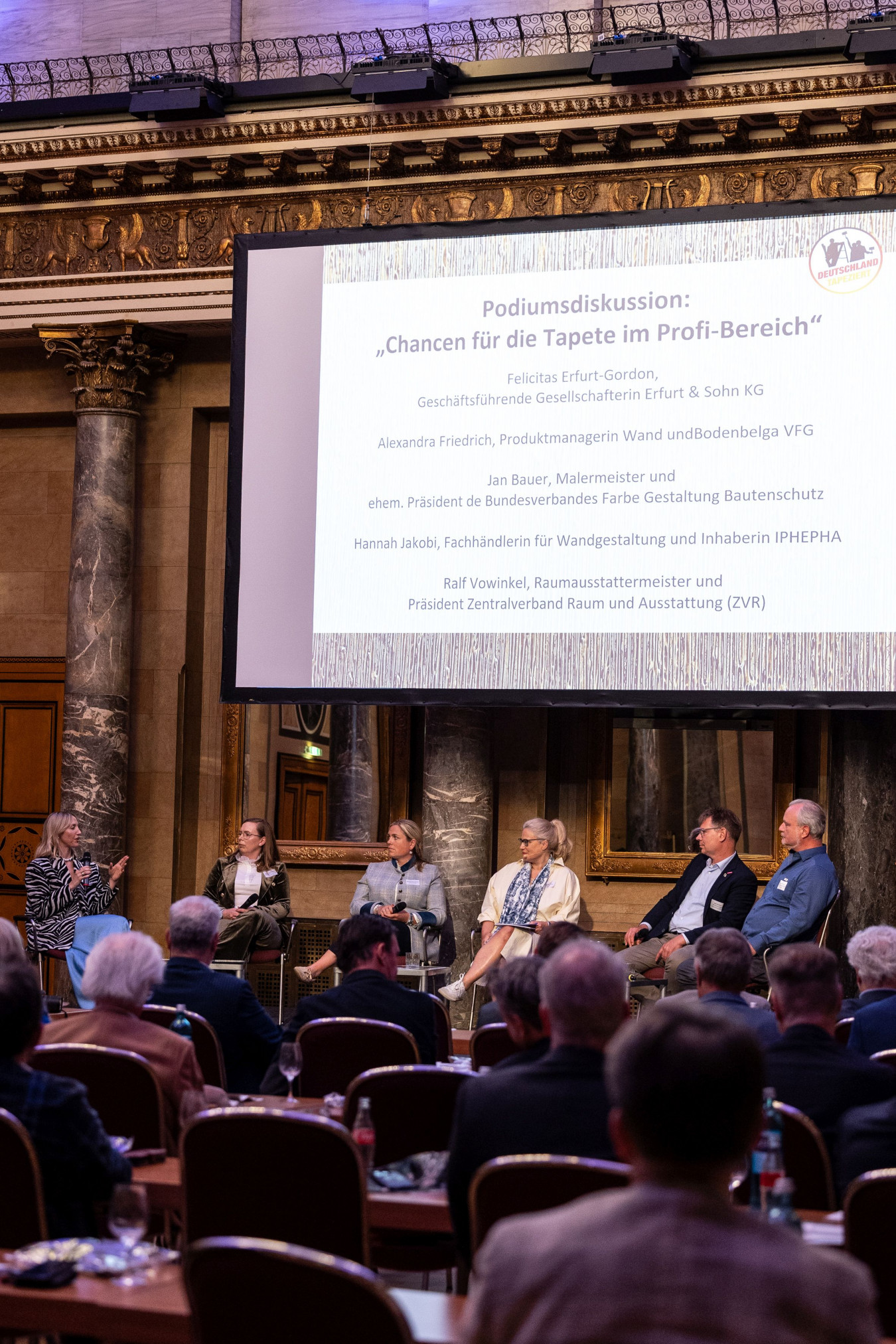 In der von „Mappe“-Chefredakteurin Natalie Häntze moderierten Runde mit Vertretern aus Industrie, Handel und Handwerk (Tapeten-Fachhändlerin Hannah Jakobi, VFG-Produktmanagerin Alexandra Friedrich, Felicitas Erfurt Gordon von Erfurt Tapeten, ZVR-Präsident Ralf Vowinkel und Jan Heinemann, Malermeister) herrschte Einigkeit: Beratungsleistungen müssen sichtbarer und verrechenbar gemacht werden, um Tapete im Profibereich attraktiver zu gestalten. Zudem wurde betont, dass Tapeten nicht nur dekorativ, sondern auch funktional – etwa als Wand-Schutz – langfristig überzeugen können.
