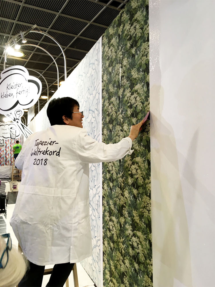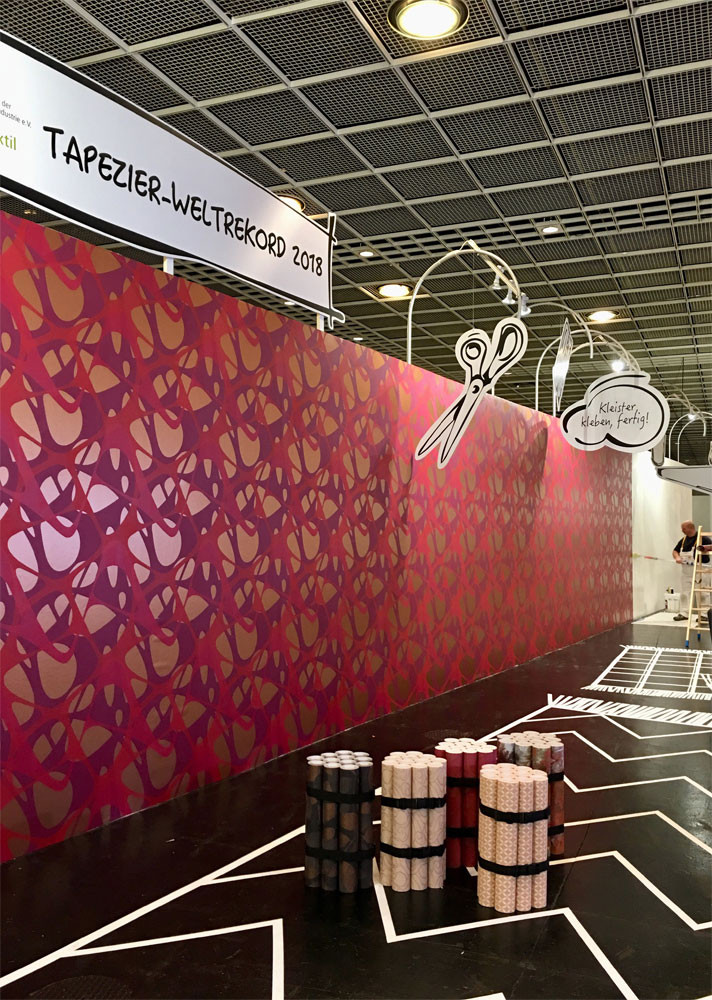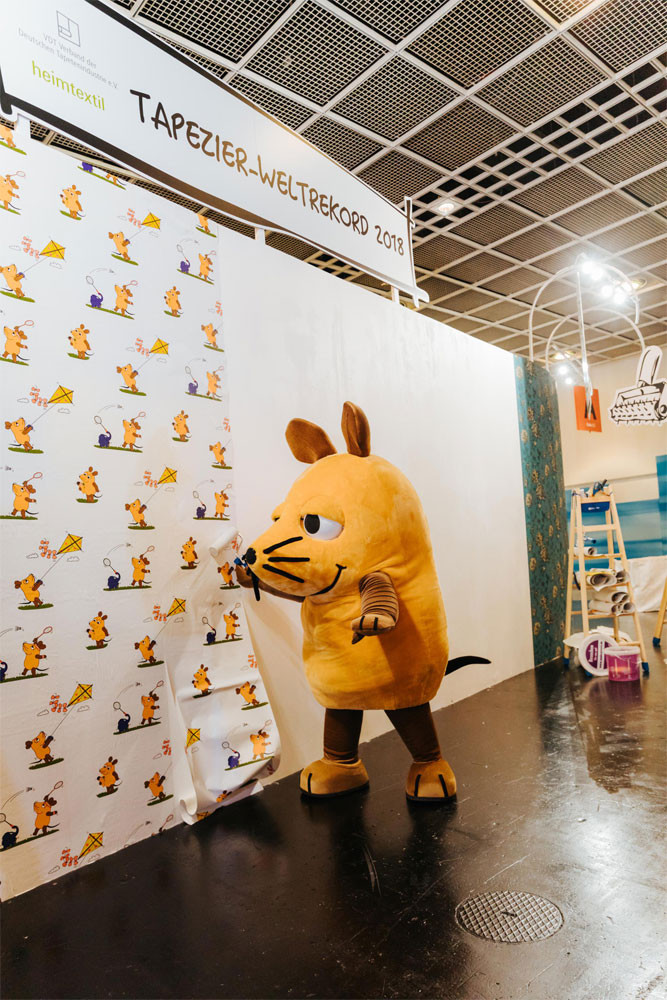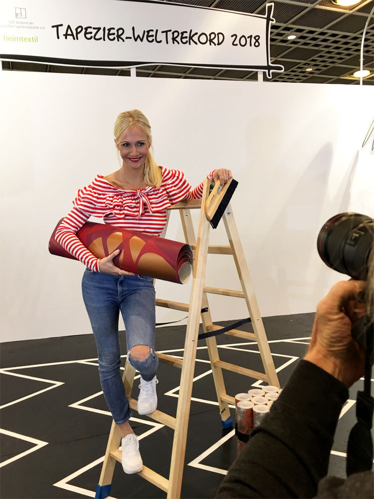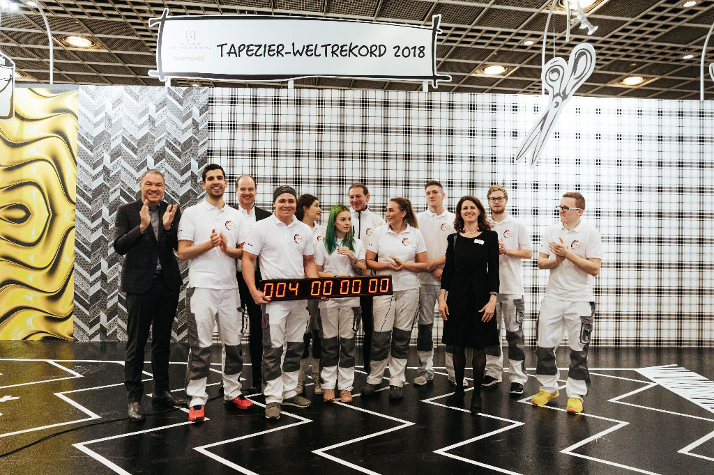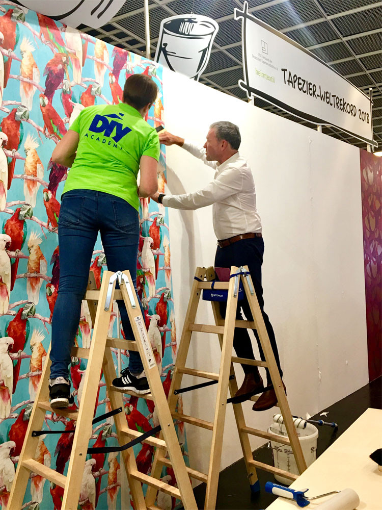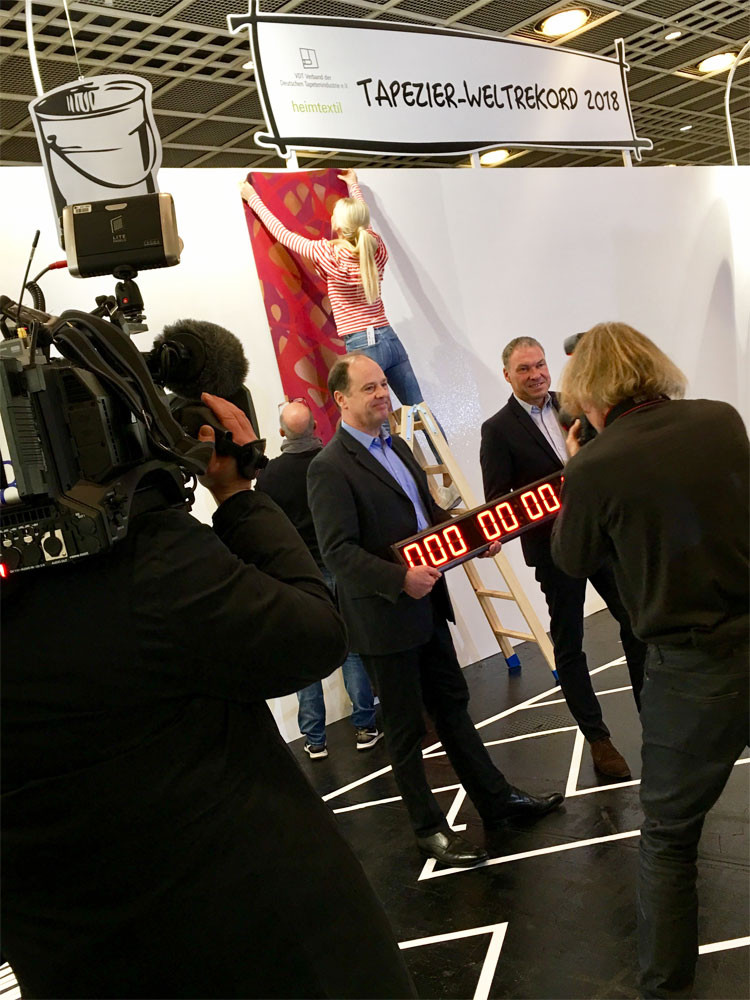Über den gesamten Messezeitraum der Heimtextil stellte der Verband der Deutschen Tapetenindustrie e.V. (VDT) in Zusammenarbeit mit der Heimtextil einen spektakulären Weltrekord im Dauertapezieren auf. Auf einer riesigen Wandfläche tapezierten Teams – vom Meister bis zum Lehrling – 96 Stunden Tapetenmuster ihrer Verbandsmitglieder. Rund um die Uhr, vier Tage und Nächte, wurde bis zum letzten Messetag (Freitag, den 12. Januar, 12.00 Uhr) tapeziert. Während der gesamten Aktionszeit unterstützten Prominente, wie TV-Moderatorin Resi Colter, “die Maus”, die amtierende “Miss-DIY” Kerstin Weiser und Star-Designer Guido Maria Kretschmer die einzigartige Aktion.