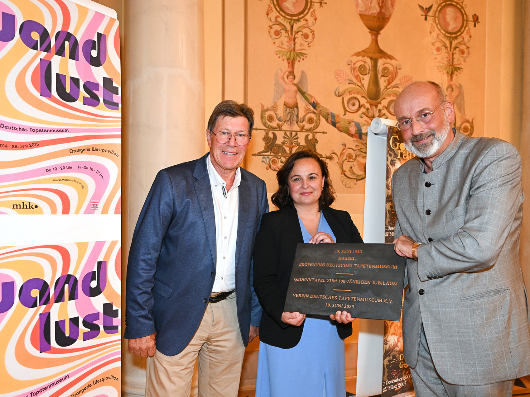 Ullrich Eitel, Vorsitzender des Tapetenmuseums, überreichte Staatssekretärin Ayse Asar und Prof. Dr. Martin Eberle, Direktor von Hessen Kassel Heritage, die Bronzetafel zum Jubiläum für den Neubau des Tapetenmuseums.