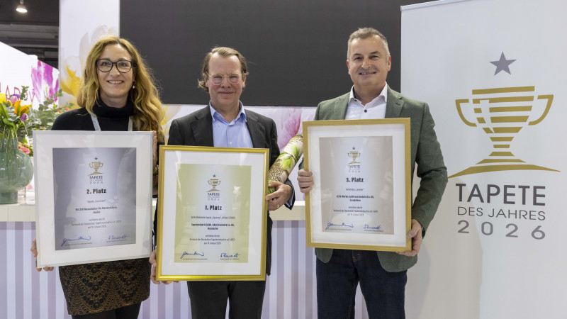 Januar 2026. Die „Tapete des Jahres 2026“ wurde am 14. Januar 2026 auf der decoteam Bühne der Heimtextil Messe in Frankfurt verliehen. Vor großem Publikum aus Industrie, Handel und Medien überreichte Karsten Brandt, Geschäftsführer des Verbands der Deutschen Tapetenindustrie e. V. (VDT), die Auszeichnungen in Gold, Silber und Bronze an die diesjährigen Preisträger.