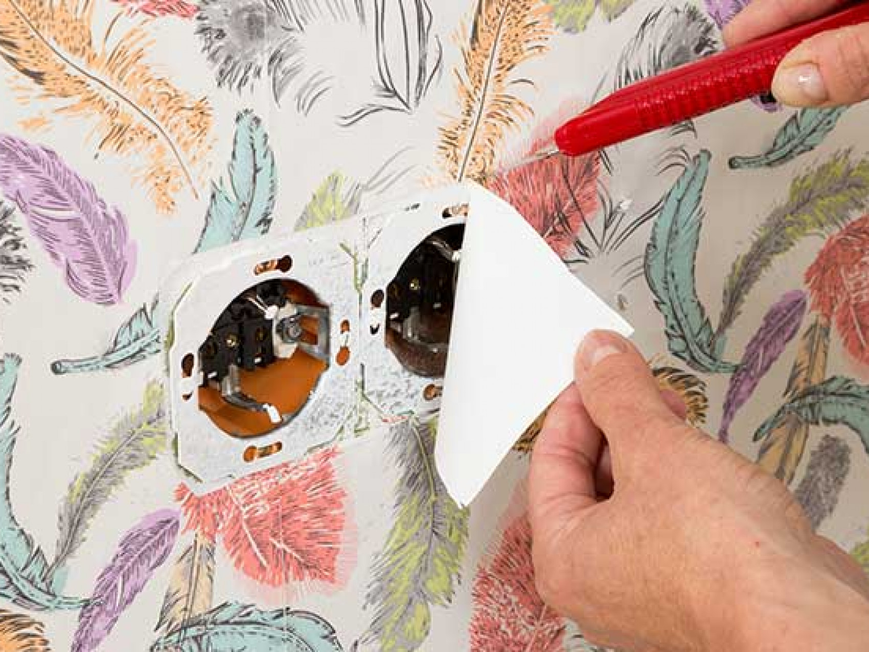 Nachdem der Kleister trocken ist, wird mit dem Universalmesser der Schalter oder das Steckdosenelement frei geschnitten. Dabei sollte der freie Bereich nicht größer als der Metallrahmen sein, damit die Blende den Ausschnitt komplett abdeckt. Am Schluss werden die Blenden einfach wieder angebracht. Auf diese Weise werden optisch völlig nahtlose Tapeten an diesen Stellen erzielt.