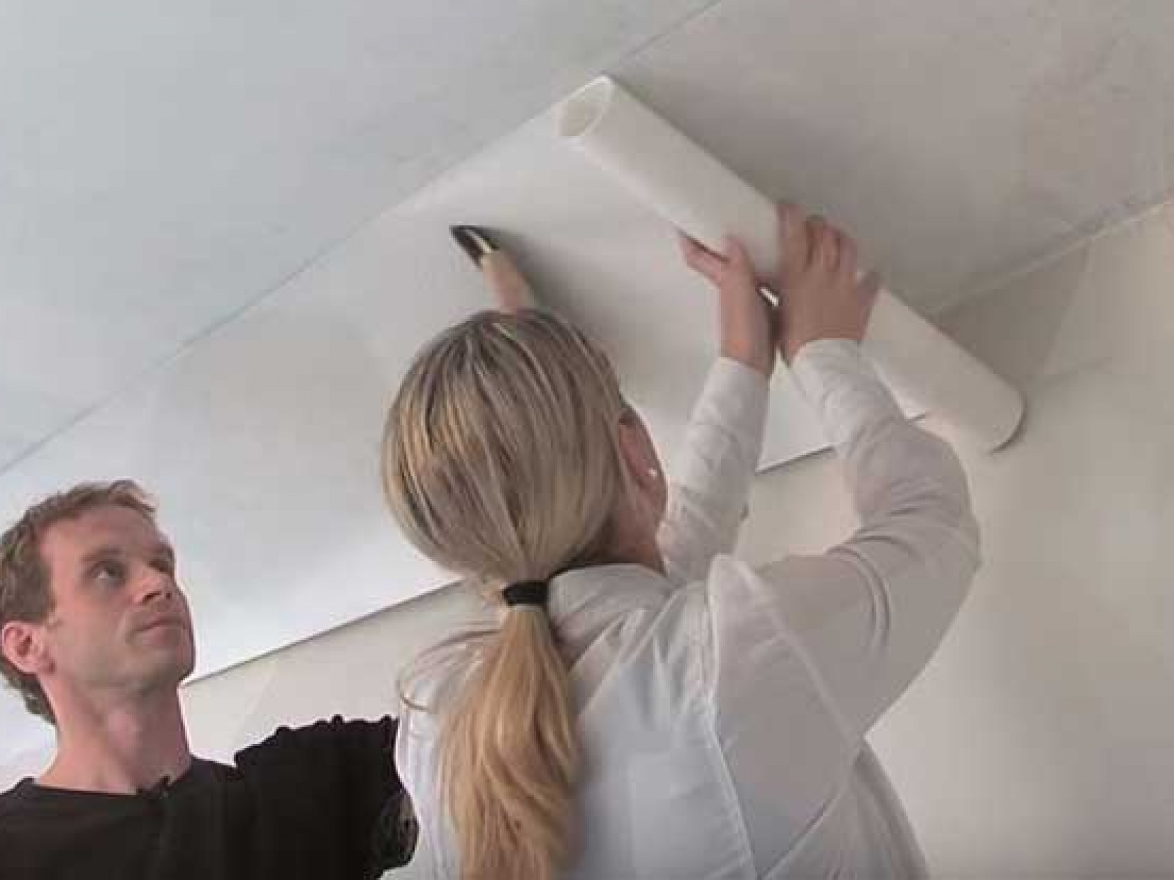 Nach Markierung der ersten Tapetenbahn wird die Tapete mit dem Licht vom Fenster weg tapeziert. Die Deckentapezierung geht zu zweit am einfachsten: Während eine Person die Tapetenbahn ansetzt und andrückt, hält die andere Person die restliche, noch zusammengelegte Bahn mit dem Besen hoch.